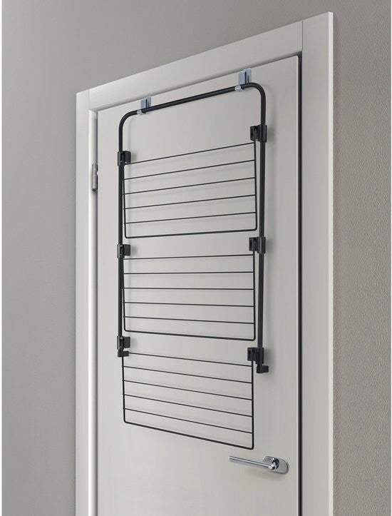 Met dit rek heb je een ruimtebesparende oplossing — de deur kan namelijk gesloten worden terwijl het droogrek eraan hangt.