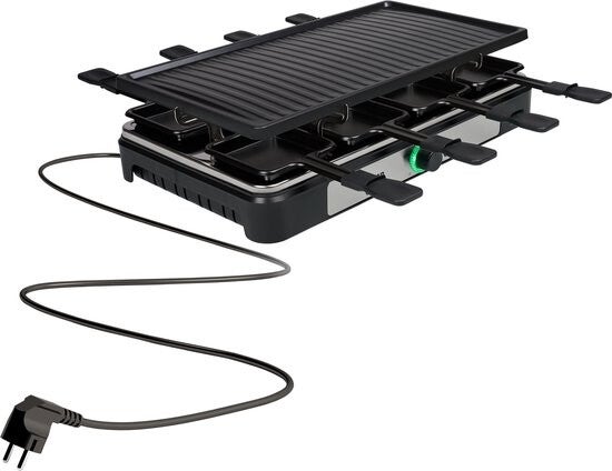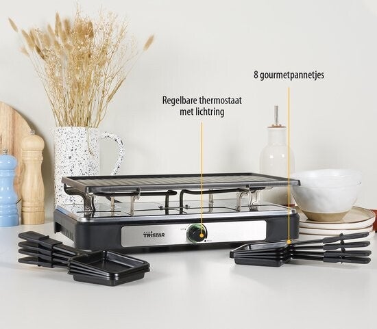 De Tristar RA-2746 - Gourmetstel is een gourmetstel voor de ultieme raclette-ervaring! Deze raclette gourmet heeft een ruim bakoppervlak van 42 x 23 cm, wat hem geschikt maakt voor maar liefst 8 personen om te bakken en grillen. Perfect voor een avond met vrienden en familie! Met zijn instelbare thermostaat en handige lichtring kun je eenvoudig de gewenste temperatuur instellen voor het smelten en/of grillen van eten. Zeg vaarwel tegen ongelijkmatige verwarming, het dubbele lus verwarmingselement zorgt voor snelle en gelijkmatige warmteverdeling!