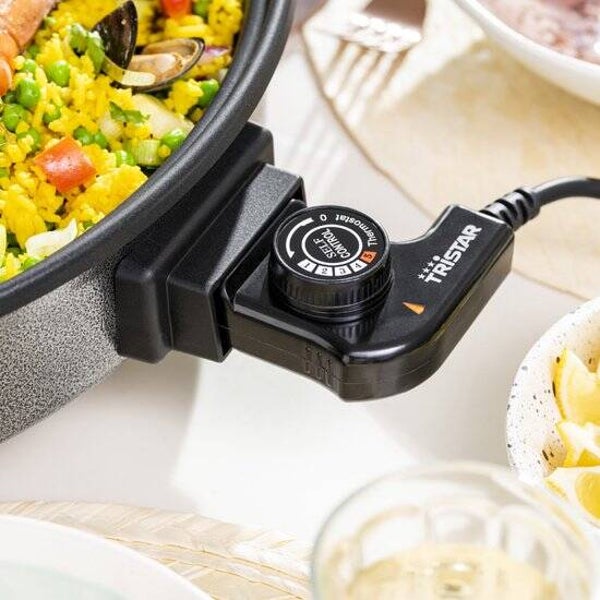 De Tristar hapjespan is van allerlei handigheidjes voorzien voor extra gebruiksgemak. Met een diameter van 40 centimeter biedt de pan heel veel ruimte. De hapjespan is voorzien van geïntegreerde handvatten om de pan gemakkelijk en veilig te verplaatsen en een regelbare thermostaat op een afneembaar snoer. De hapjespan staat stabiel dankzij de antislipvoetjes. Door het transparante deksel met stoomuitlaat kun je gemakkelijk in de gaten houden hoe het met het eten gaat.