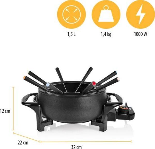 De Tristar FO-1107 - Fondueset Elektrisch is geschikt voor chocolade-, olie-, bouillon-, of kaasfondue. De regelbare thermostaat heeft handige afbeeldingen waardoor je altijd de perfecte temperatuur selecteert. De luxe, matzwarte fonduepan is volledig van aluminium en heeft een duurzame antiaanbaklaag, waardoor deze makkelijk schoon te maken is. Dankzij de inhoud van 1.5 liter is de fonduepan geschikt voor 8 personen.