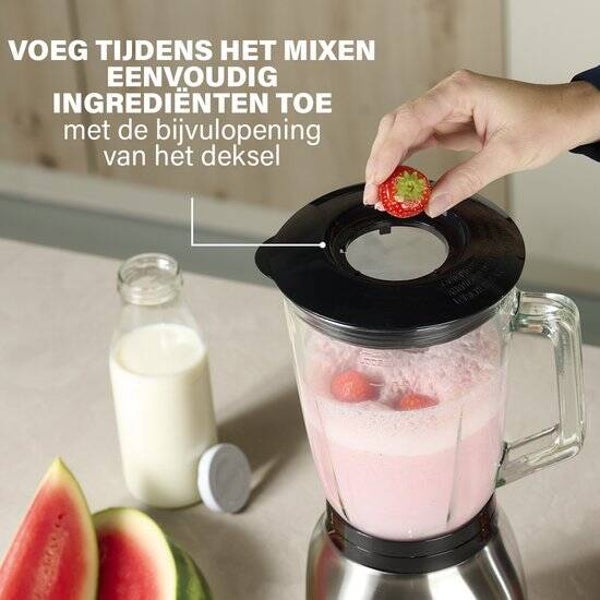 Het sterke messenblok met zes roestvrijstalen messen is geschikt om harde groente- en fruitsoorten te malen. Ideaal voor als je bevroren fruit en ijs wil gebruiken in cocktails of milkshakes. Je hoeft alleen de ingrediënten toe te voegen en de blender doet voor jou het werk. Iets vergeten toe te voegen? Gebruik dan de navulopening van de deksel om het er tijdens het mixen alsnog gemakkelijk in te doen. De onderdelen haal je moeiteloos uit elkaar en ze zijn vaatwasserbestendig. Daardoor is de blender erg makkelijk schoon te maken.