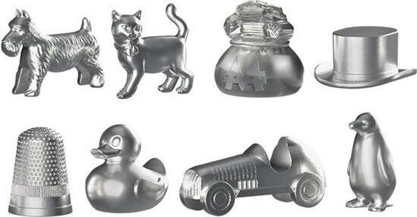 - VERPLAATS JE IN STIJL MET 8 METALEN PIONNEN: kies uit 8 Monopoly-pionnen, allemaal groter dan in de vorige edities: Dwarrel de hond, Mollie de kat, Raceauto, Hoge hoed, Vingerhoed, Badeendje, Pinguïn en de Geldzak