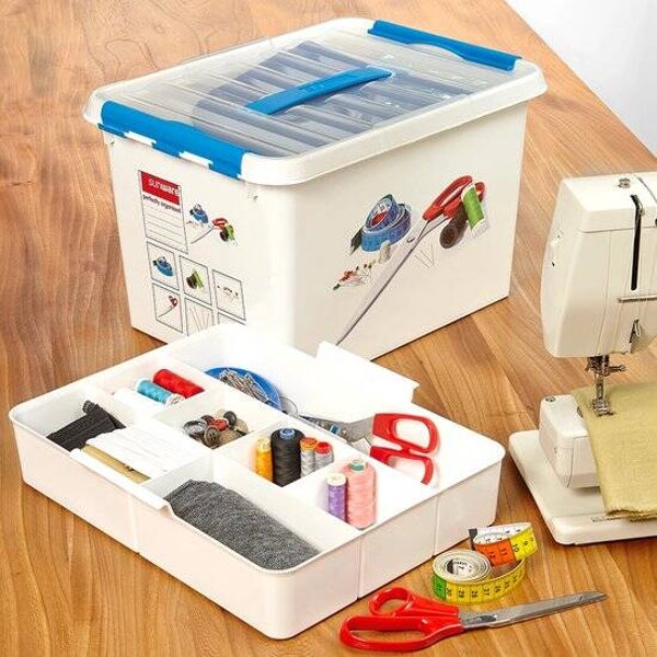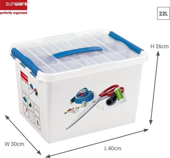 De Sunware Q-line naaidoos 22L met uitneembare inzet houdt je naaispullen netjes geordend. Deze naaidoos wordt leeg geleverd (zonder inhoud), zodat je ’m zelf kunt indelen als naaidoos opbergbox of naaimand. De stevige sluitclips en een handgreep zorgen ervoor dat je de naaidoos veilig kunt afsluiten en makkelijk meeneemt. Het wit/blauwe design met duurzame print van deze naaikoffer is direct herkenbaar.