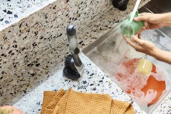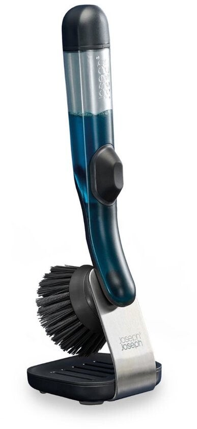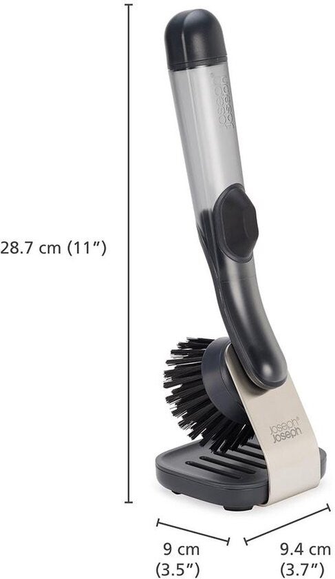 De Joseph Joseph SinkTech afwasborstel met zeepdispenser en opbergstandaard maakt schoonmaken makkelijker en efficiënter. Dankzij het slimme navulbare handvat met drukknop kun je met één simpele klik vloeibare zeep doseren, precies waar je het nodig hebt. Net als alle producten uit de SinkTech serie is deze borstel voorzien van een vervangbare kop, waardoor hij langer meegaat en je minder afval produceert.