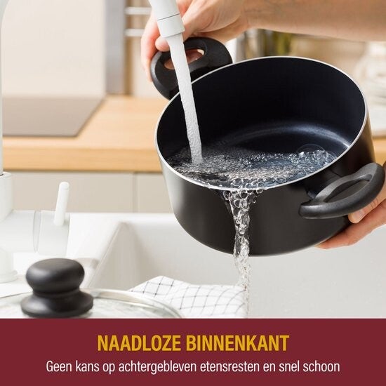 - De keramische antiaanbaklaag zonder schadelijke PFAS-chemicaliën maakt koken makkelijk. Je hebt minder boter of olie nodig, en schoonmaken is een fluitje van een cent.