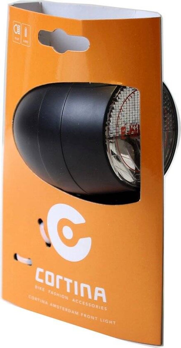 Cortina koplamp Amsterdam E-bike 6-48v zwart met zwarte ring op blisterkaart. Uniek compact design, Ingebouwde witte reflector, Spatwaterdicht, Zeer scherp licht. Bediening vanaf de E-bike zelf. Wordt geleverd met draad voor E-bike. Cortinalogo zit aan de zijkant. Verbeterde uitvoering.