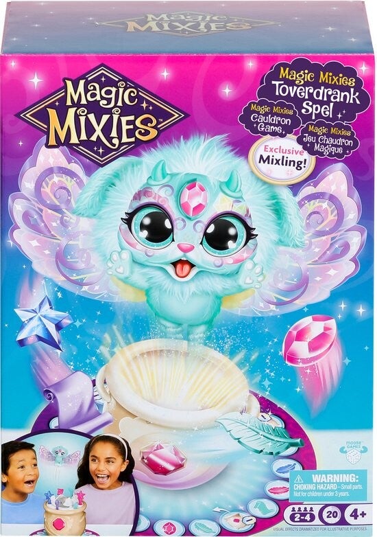 Magic Mixies is er nu ook in een spannend Pop-up spel! Kies een Mixling poppetje en draai aan de draaischijf om Magische ingrediënten te verzamelen. Zodra je een set van ingrediënten verzameld hebt, stop je ze in de gaten van de ketel om de Magische Toverdrank te maken. In de Ketel zit een kleine Gevleugelde Mixie verstopt. Deze wacht geduldig op de juiste mix van ingrediënten en zodra hij tevreden is met de Toverdrank, zal hij op Magische Wijze uit de Ketel tevoorschijn komen! Als jij degene bent die hem uit de Ketel laat vliegen, ben jij de winnaar! Geen batterijen nodig. Aantal spelers: 2-4 spelers. Leeftijdsindicatie: 4 jaar+.