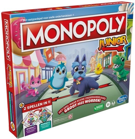 - 2-in-1 Monopoly: het spel voor kleine handelaars dat met je kind meegroeit! Dit Monopoly Junior-spel biedt twee keer zoveel plezier met een dubbelzijdig spelbord, met 2 Monopoly-spellen en 2 spelniveaus