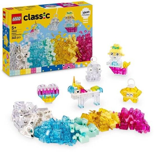 De LEGO® Classic Magische transparante doos (11040) zorgt keer op keer voor creatief bouw- en speelplezier. Met 340 kleurrijke stenen, waarvan er vele transparant zijn, plus diverse speciale elementen kunnen kinderen betoverende modellen creëren met eindeloze fantasierijke ontwerpen. Kinderen beginnen met het bouwen van een hart, spook, zeemeermin en eenhoorn. Naarmate hun zelfvertrouwen groeit, bouwen ze een ruimteschip, wolk, vallende ster, vogel, narwal, ijsje en bloem. Vervolgens kunnen ze het creatieve plezier nog verder vergroten met een groot kasteel en een draak! De doorschijnende stenen, oog- en mondelementen en ophangelementen zorgen voor nog meer leuke mogelijkheden.