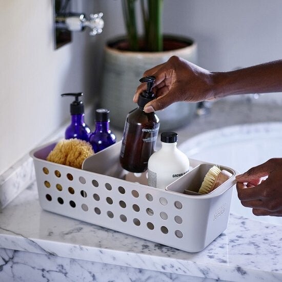 Deze compacte badkamermand is perfect voor het opbergen van een breed scala aan verzorgingsbenodigdheden, zoals zeepflessen, deodorants, haaraccessoires, geuren en meer. Het heeft diepe, geventileerde zijkanten voor een goede luchtcirculatie, een verplaatsbare pot voor kammen, borstels en scharen en een verplaatsbare verdeler. Ideaal voor het organiseren van spullen op planken of in lades, en demonteerbaar voor eenvoudige reiniging.