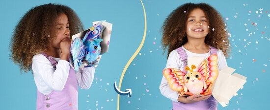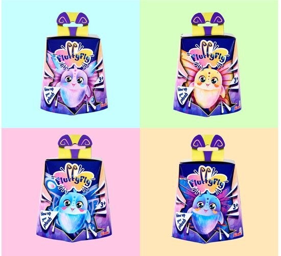 Beleef een betoverend wow-moment: zodra je de verpakking opblaast met het meegeleverde rietje, plopt Fluffyfly eruit en spreidt hij zijn kleurrijke vleugels – omringd door vrolijke confetti!