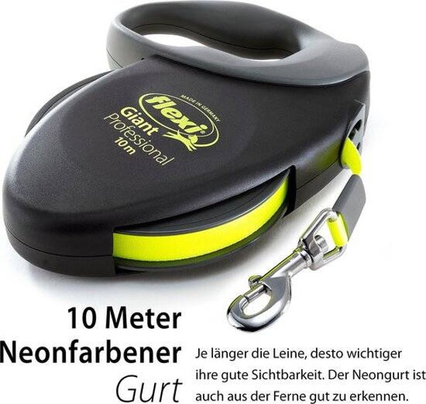 Het uitlaten van je viervoeter was nog nooit zo prettig als met de rollijnen van Flexi. Eén van die rollijnen is de Giant Professional L, speciaal voor grote en sterke honden. Door zijn stijlvolle design en ergonomische soft-handgreep ligt de lijn goed in de hand. De lijn rolt altijd soepel op en af maar dankzij het innovatieve remsysteem kan je de lijn ook afstellen op een vaste lengte die je zelf fijn vindt. In tegenstelling tot de New Classic, valt de Giant Professional L extra goed op in het donker.