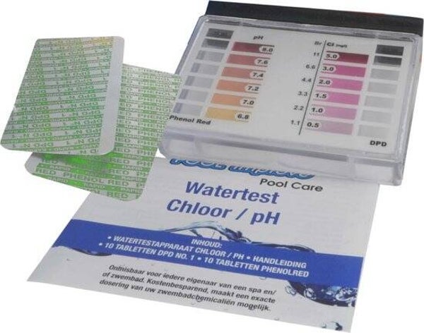 - 1 testset voor het meten van de pH-waarde en het chloorgehalte (inclusief 2x10 tabletten)