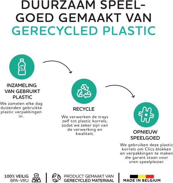 STEVIG EN VEILIG - De bouwstenen zijn gemaakt in België van recycled plastic dat niet giftig en makkelijk schoon te maken is. Gewoon afvegen met een vochtig doekje en de blokken zijn opnieuw proper.