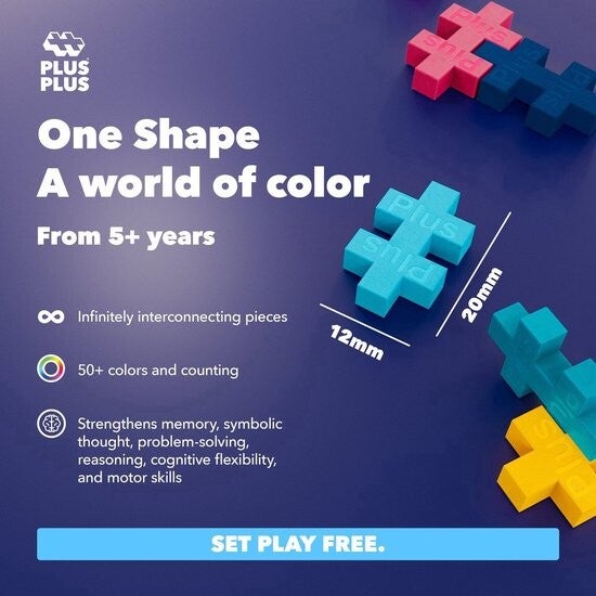One shape, endless possibilities! Plus-Plus heeft een uniek ontwerp: één vorm in twee formaten die perfect in elkaar passen. Elke bouwsteen meet 20 mm x 12 mm en is geschikt voor kinderen vanaf 5 jaar. Met slechts één herhalend element kunnen kinderen alles bouwen wat ze maar kunnen bedenken – zowel in 2D als in 3D. Plus-Plus is het perfecte educatieve speelgoed dat de fijne motoriek, creativiteit, concentratie en geduld stimuleert. Kinderen kunnen kleurrijke mozaïeken maken of juist complexe 3D-constructies bouwen. Bovendien zijn alle sets met elkaar te combineren, zodat de mogelijkheden écht eindeloos zijn!
