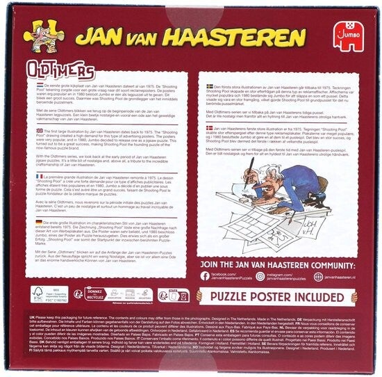 De officiële marketingtekst vanuit de fabrikant voor Jan van Haasteren Oldtimers - De Vrijgezel - 1000 stukjes puzzel.Met de Oldtimers-serie kijken we terug naar de vroege periode van Jan van Haasteren legpuzzels. Het is een beetje nostalgie en bovenal een eerbetoon aan het ongelooflijke vakmanschap van Jan van Haasteren. In deze puzzel maak je kennis met "Baron van Tast tot Zeveren". Dat was een stripfiguur die Jan van Haasteren vroeger tekende. Deze tekening is gemaakt in 1974. In deze puzzel vind je al een aantal terugkerende elementen zoals: de pijl, ogen, kogelgaten of kijkgaatjes, inktvis, de muis en de kat, en de bekende kleine handjes.