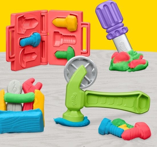- 3 SPEELGOEDGEREEDSCHAPPEN: de Play-Doh-accessoires zijn de gereedschapskist-boekvorm, speelgoedschroevendraaier en hamerstempel