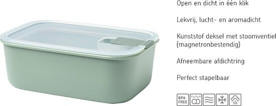 De Mepal EasyClip vershouddoos is de bewaartopper voor de lekkerste gerechten in de koelkast of vriezer. Dit vershoudbakje voldoet aan alle wensen in de keuken, omdat dit bakje geschikt is voor de diepvries, stoomoven, magnetron en vaatwasmachine. Bij het opwarmen van het eten in de stoomoven of magnetron is het belangrijk dat het unieke stoomventiel geopend is. Na het opwarmen kan het gerecht worden geserveerd op tafel. Het weldoordachte design van dit kunststof vershoudbakje zorgt voor een super strakke organisatie in je koelkast en vriezer. Door de transparante deksel zie je gelijk wat er in de box zit. Met één klik kan de bewaardoos geopend worden en is ook met één klik lek- en luchtdicht afgesloten.