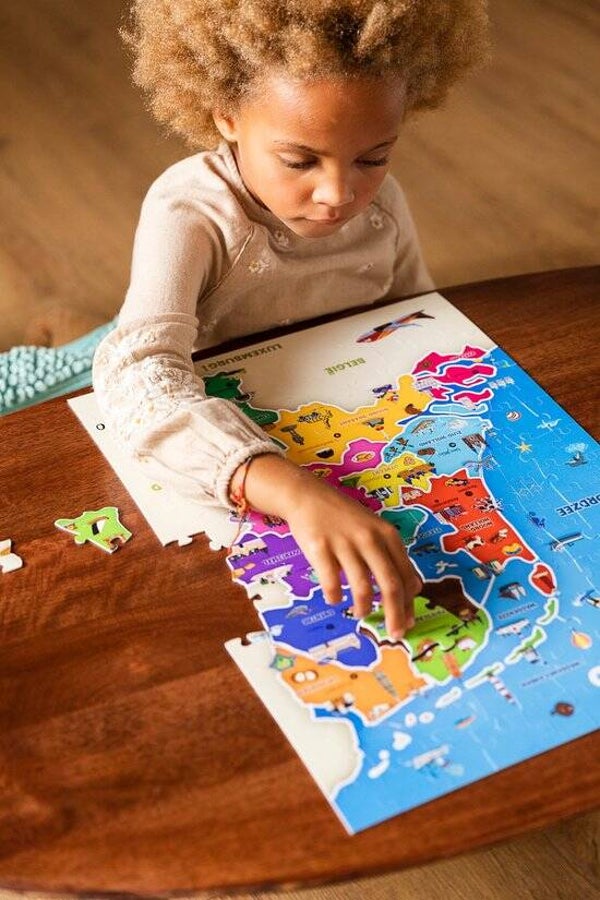 Educatieve puzzel waarmee kinderen op een leuke manier leren over de Nederlandse aardrijkskunde en enkele van haar karakteristieke en culturele elementen.