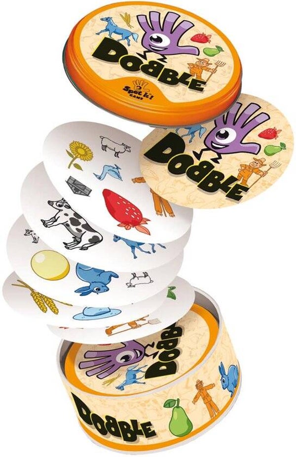 Vind de gelijke boerderij-symbolen op twee verschillende kaarten voordat je tegenstanders de symbolen zien! Bij Dobble Boerderij zijn snelheid, observatie en reflexen van groot belang om te winnen. Het spel bevat 30 kaarten waarop steeds 6 symbolen staan afgebeeld. Hierbij moet je bijvoorbeeld denken aan een tractor, varken, appel, konijn of een molen. Als jij de eerste bent die het symbool herkent mag je een kaart nemen, een kaart plaatsen of een kaart afleggen volgens de regels van de verschillende mini-spelletjes die je kan spelen.