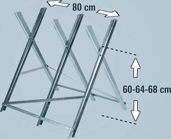 De robuuste, gecoate hoekprofielen zijn gemaakt van duurzaam metaal. Om ergonomisch en comfortabel te kunnen werken kan de hoogte van de kettingzaagbok in 3 verschillende hoogtes worden aangepast; 600 / 640 / 680 mm. Dankzij het inklapsysteem kan de zaagbok ruimtebesparend worden opgeborgen in de schuur, garage of kelder.