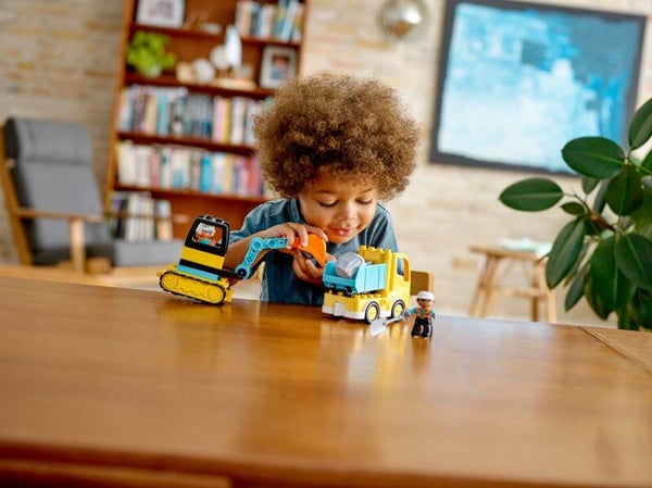 Met 2 figuren van bouwvakkers, vrachtwagen met kiepfunctie en graafmachine met ronddraaiende schop hebben peuters en hun ouders alles wat ze nodig hebben om de klus te klaren. Kinderen ontwikkelen hun fijne motoriek wanneer ze met de voertuigen rijden en deze bedienen om allerlei taken op de bouwplaats uit te voeren. Ze kunnen speelgoedrotsblokken opscheppen en op de truck laden. Maar kijk uit, het rotsblok splijt gemakkelijk open! Het LEGO DUPLO Truck & Graafmachine met rupsbanden (10931) bouwspeelgoed stimuleert kleine bouwers om eindeloos fantasierijk speelplezier te beleven.