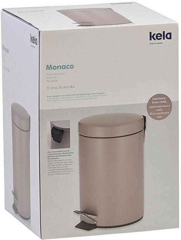 De Monaco pedaalemmer van Kela heeft een inhoud van 3 liter en misstaat zeker niet in je badkamer of toilet. De buitenkant is makkelijk schoon te maken en goed te combineren met andere badkamer items. De binnenemmer is gemaakt van zwart kunststof en gemakkelijk te verwijderen met het hengsel waardoor de afvalzak zonder problemen verwisselt kan worden.