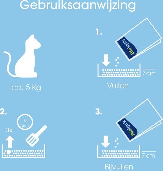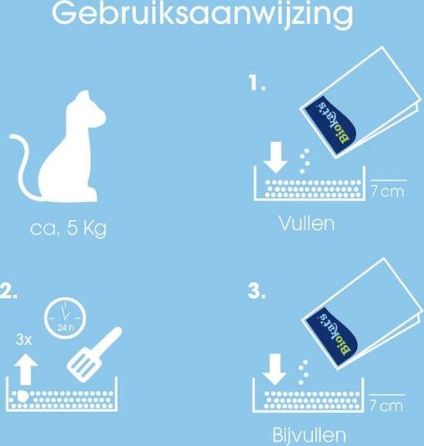 - BEWARING: Sluit de papieren zak en bewaar Biokat's bentonietstrooisel steeds op een droge plaats
