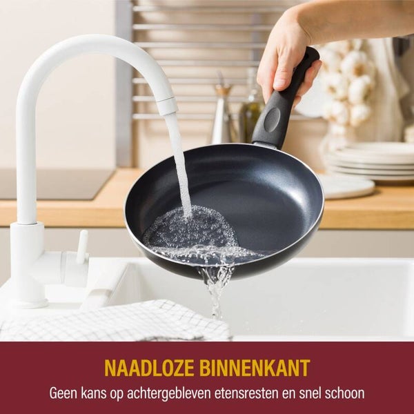 - De keramische antiaanbaklaag zonder schadelijke PFAS-chemicaliën maakt koken makkelijk. Je hebt minder boter of olie nodig, en schoonmaken is een fluitje van een cent.
