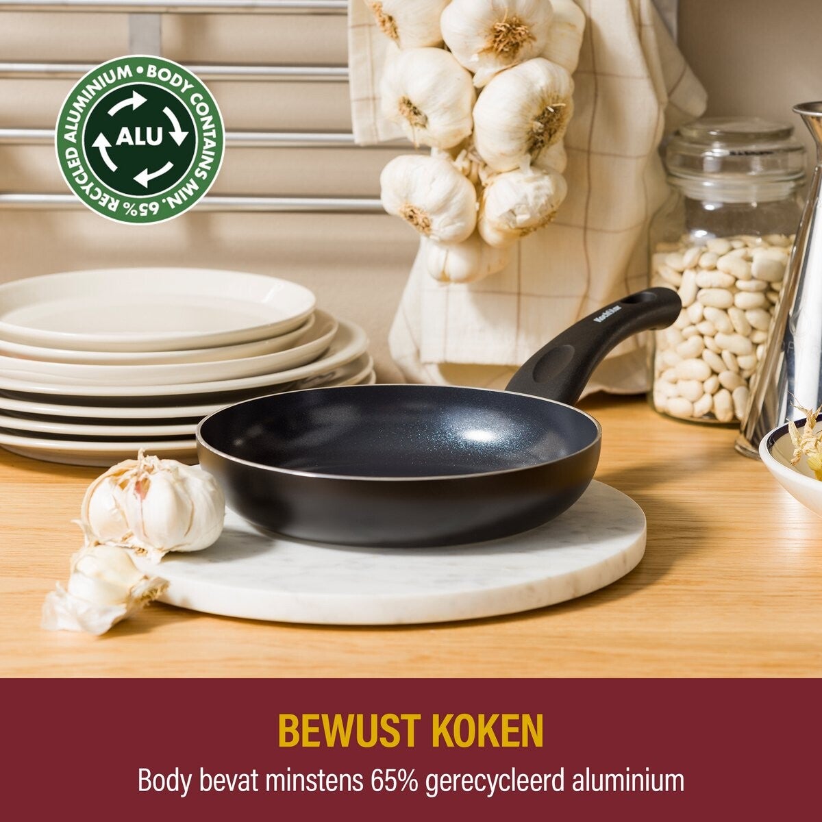 Deze pan is gemaakt van hoogwaardig aluminium (minstens 65% gerecycled aluminium) en warmt gelijkmatig op. Daardoor geniet je elke keer van perfecte kook- en bakresultaten.