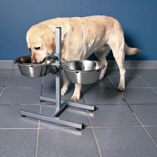 Hondenstandaard inclusief 2 RVS voer/waterbakken. De standaard heeft de vorm van een H en is uitgevoerd in een metaal met hamerslageffect in poedercoating. De standaard is in hoogte verstelbaar om er voor te zorgen dat de hond de juiste lichaamshouding heeft tijdens het drinken/eten, dit ondersteunt de spijsvertering. Doorsnede van de RVS bakken zijn 15 cm. De onderzijde is voorzien van rubberen voetjes om uw vloer te beschermen.