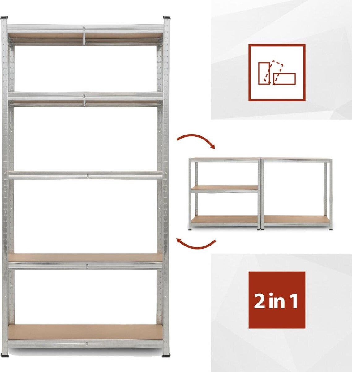 Hoog laadvermogen: In totaal kan dit rek 875 kg aan, dat maakt 175 kg per plank. Om de maximale capaciteit te benutten, verdeel je het gewicht gelijkmatig.