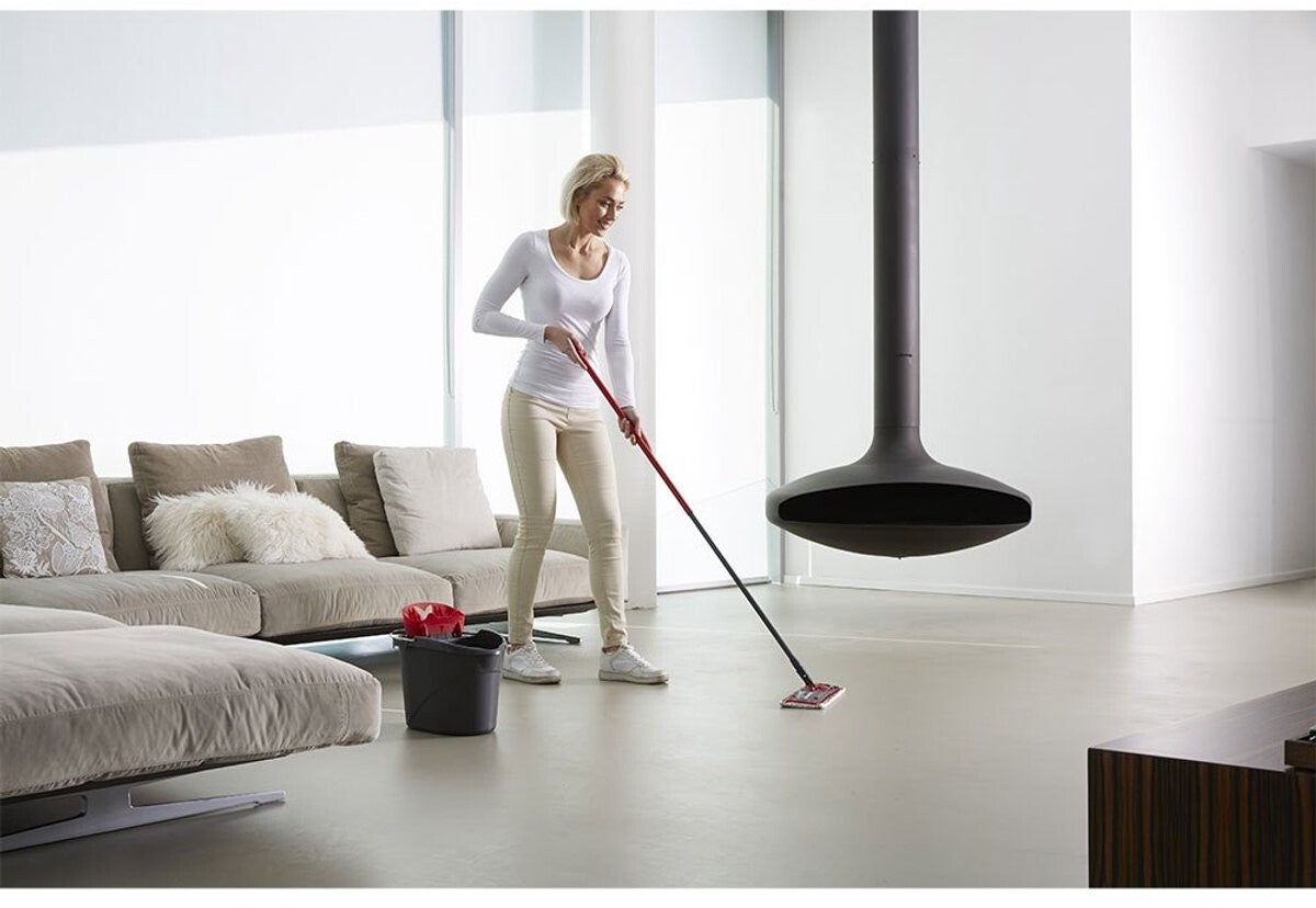 - De speciaal ontworpen emmer en asymmetrische pers verzekeren een optimale bevochtiging van de hoes voor gebruik op verschillende soorten vloeren: tegels, vinyl, natuursteen, parket of laminaat.