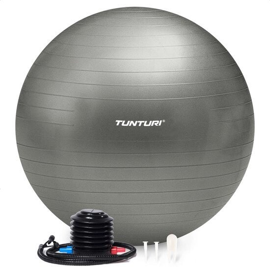 Tunturi Anti Burst Fitness bal met Pomp - Yoga bal 90 cm - Pilates bal - Zwangerschapsbal – 220 kg gebruikersgewicht - Incl Trainingsapp – Zilver