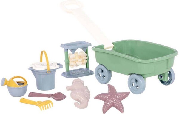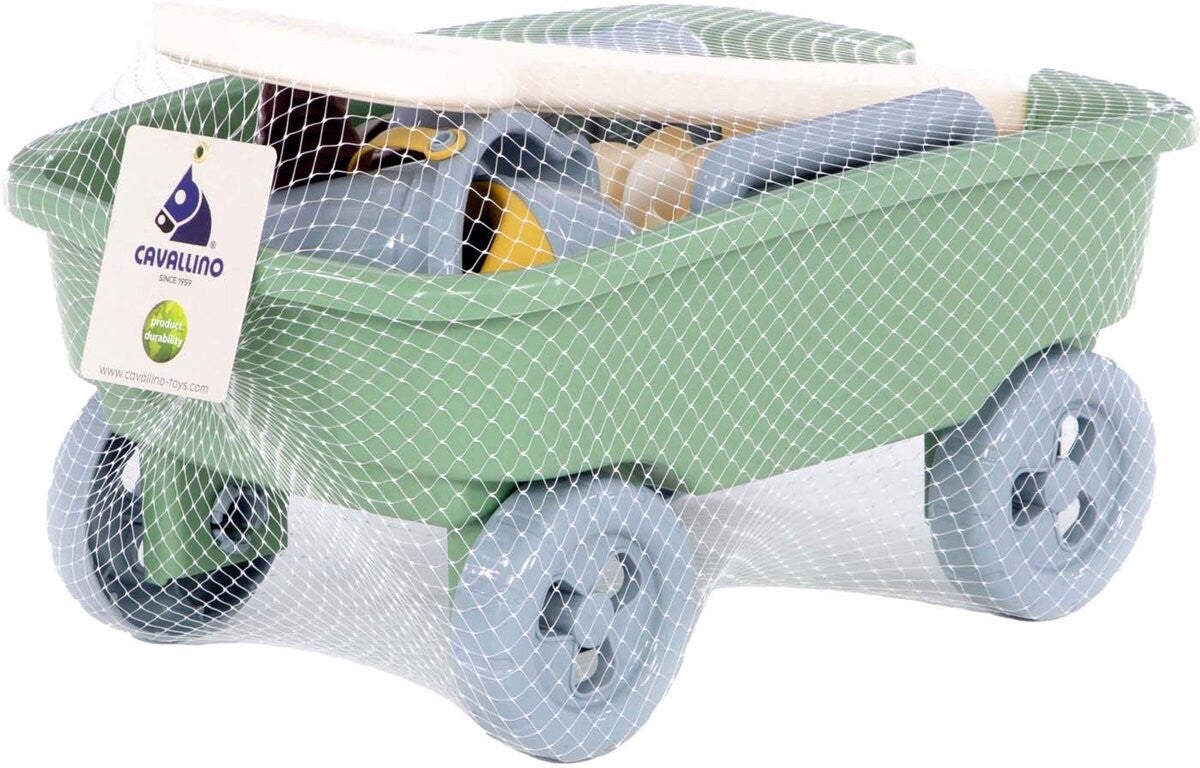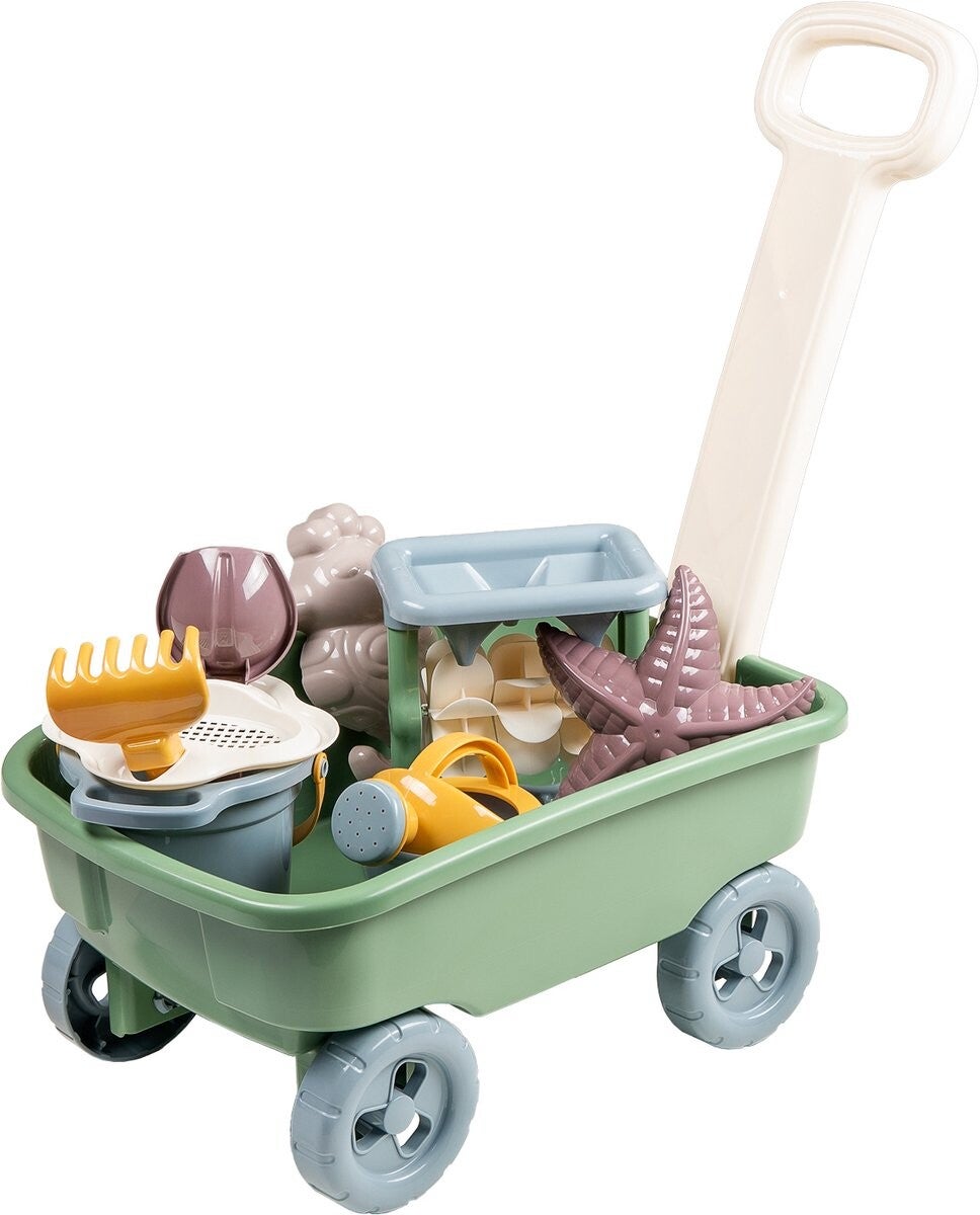 Cavallino kunststof bolderwagen met strandset, 9dlg. Met een emmer, zeefdeksel, schep, hark, zandmolen, zandvormen en een gieter. Geschikt vanaf 12 maanden.