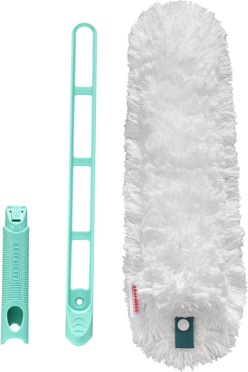 Duurzaam, effectief en werkt SUPER – met de SUPERDUSTER XL plumeau van Leifheit verwijder je stof in een handomdraai. De extralange plumeau bestaat uit textiel en kan met de drukknop van de handgreep afgenomen worden en dan gewassen worden. De overtrek kan tot 50 keer in de wasmachine gewassen worden op 40°C – zo bespaar je niet alleen geld, maar het is ook duurzamer dan de gebruikelijke wegwerp stofdoekjes. Want weggooi-wisserdoekjes, die onnodig afval opleveren, hoef je niet te kopen. Leifheit plumeau SUPERDUSTER XL is gemakkelijk schoon te maken: simpel uitkloppen, indien nodig wassen in de wasmachine, vervolgens opschudden en laten drogen. Zo krijgt het textieldeel zijn flexibele, zachte volumineuze vorm terug. Na het wassen is de plumeau weer volledig inzetbaar, met dezelfde schoonmaakprestaties. Dankzij het XL formaat en het 360°-rondom-textieldeel van microvezel neemt de plumeau stof, haren en allergenen uitstekend op, ook op grote en hoger gelegen oppervlakken, en houdt alle vuil netjes vast in de vezels, zonder opwervelen of verspreiden van het vuil. Plumeau SUPERDUSTER XL heeft een brede en een smalle kant, voor handig schoonmaken van grote oppervlakken maar ook een kleine nis of tussenruimte. De ergonomische handgreep van gerecycled kunststof ligt goed in de hand. De handgreep bestaat uit 96% gerecycled-kunststof en is dus duurzaam. Bijzonder praktisch: de plumeau is voorzien van het Leifheit Click System, en is dus te combineren met de stelen van dit kliksysteem. Als je de plumeau op een langere steel klikt, kun je de bovenkant van de kast of een hoog geplaatste plank gemakkelijk en veilig schoonmaken – zonder op een stoel, keukentrap of ladder te hoeven klimmen.