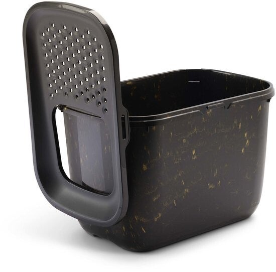 De Savic Kattenbak Hop In Marble Zwart/Goud 58,5X39X39,5 cm is een moderne kattenbak met boveninstap. Als jouw kat staand plast of veel graaft in de bak, heb je met een normale kattenbak vaak veel troep buiten de bak op te ruimen. Deze Hop In kattenbak van Savic heeft hoge zijkanten en een opening aan de bovenkant in plaats van de voorkant. Hierdoor blijft al het grit, urine en ontlasting mooi in de bak. Voor extra hygiëne is het deksel licht aflopend en voorzien van kleine gaatjes: als de kat over het deksel loopt bij het verlaten van de bak, valt de kattenbakvulling zo weer de bak in.