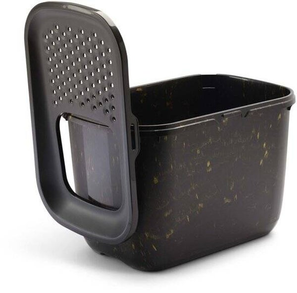 Bovendien is de bak voorzien van handgrepen in de bodem en een deksel dat kan worden opgehangen voor gemakkelijke reiniging. Ook kun je aan het haakje de kattenbakschep ophangen.