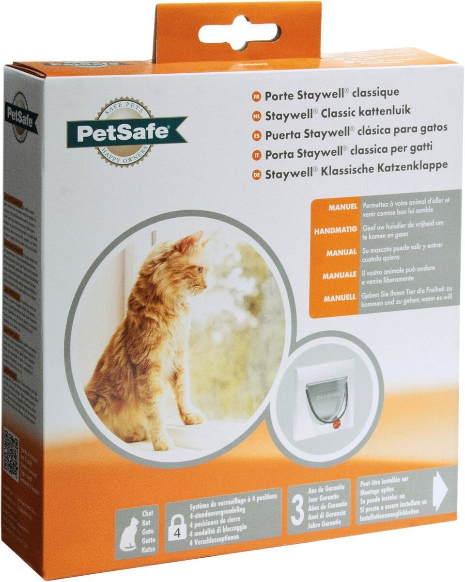 De Staywell handmatig te bedienen kattenklep heeft een veiligheidsslot met 4 standen (gesloten, open, alleen naar binnen, alleen naar buiten) en een weerbestendige vergrendeling zodat u beter toezicht kunt houden op de toegankelijkheid tot het huis voor uw kat. Deze kattenklep is eenvoudig te installeren door zijn universele maten voor ramen, muren en deuren tot op 5,7 cm dikte.