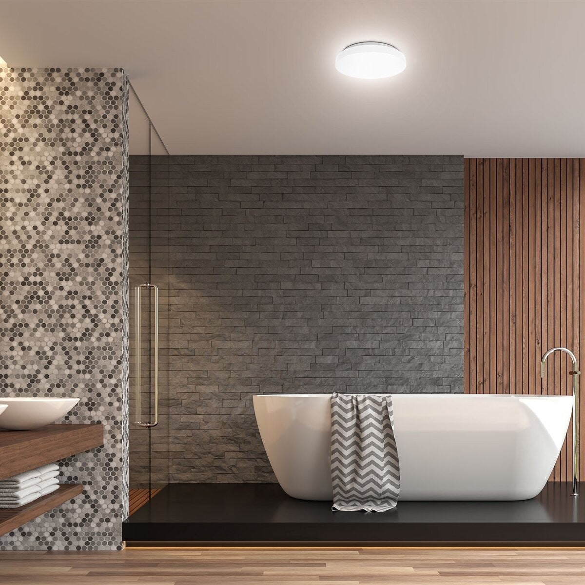 De LED plafondlamp met speciale IP44 gecertificeerde spatwaterdicht is perfect voor uw badkamer. De ultra platte (5,8 cm) vochtwerende badkamerlamp zorgt voor een uitstekende, niet-verblindende verlichting.