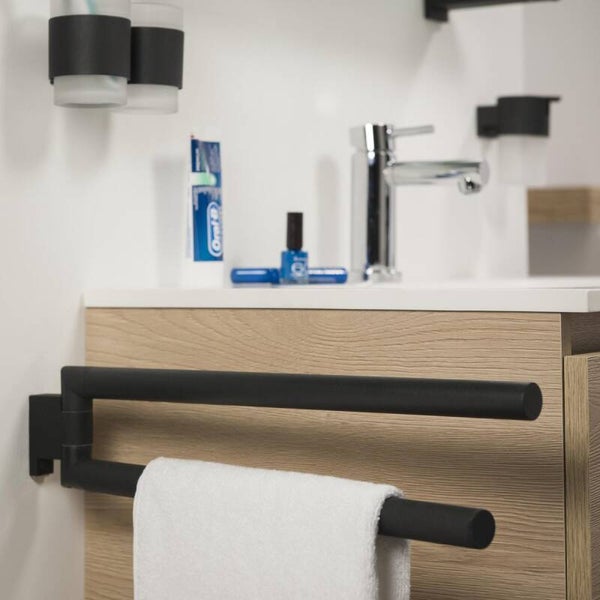 Het 2-armige handdoekrek uit de Tiger Bold serie is uitgevoerd in de kleur mat zwart. De beweegbare armen bieden plaats aan twee handdoeken en geven een optimale invulling aan de ruimte rondom de wastafel. Het 2-armige handdoekrek is eenvoudig te bevestigen, doordat gebruik gemaakt wordt van een muurplaatje zijn de bevestigingsmaterialen niet zichtbaar. De Bold serie bestaat tevens uit een groot aantal aanvullende accessoires voor de badkamer en het toilet, allemaal in één stijl.