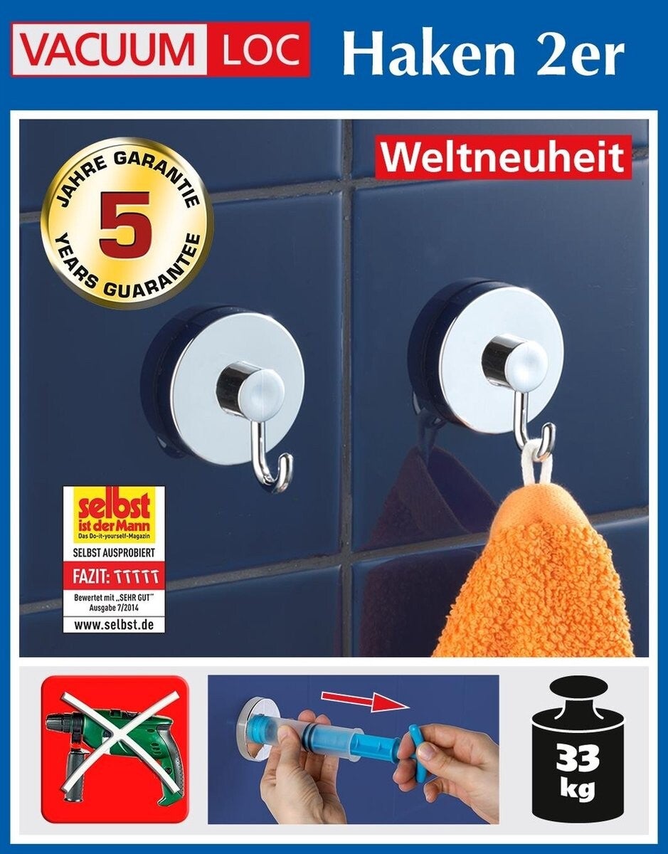 Het unieke Vacuum-Loc® bevestigingssysteem zorgt voor een een snelle, eenvoudige en veilige bevestiging op een gladde, niet poreuze wand zonder boren en schroeven. Montage van de handdoekhaakjes via het Vacuum-Loc® systeem is dankzij de pomp erg eenvoudig. Met de meegeleverde pomp wordt de lucht uit de adapter/wandsteun gezogen, waardoor er binnenin een vacuüm ontstaat. Daarna de haakjes erop schuiven en klaar. De adapters en de haakjes kunnen daarna meteen in gebruik worden genomen.