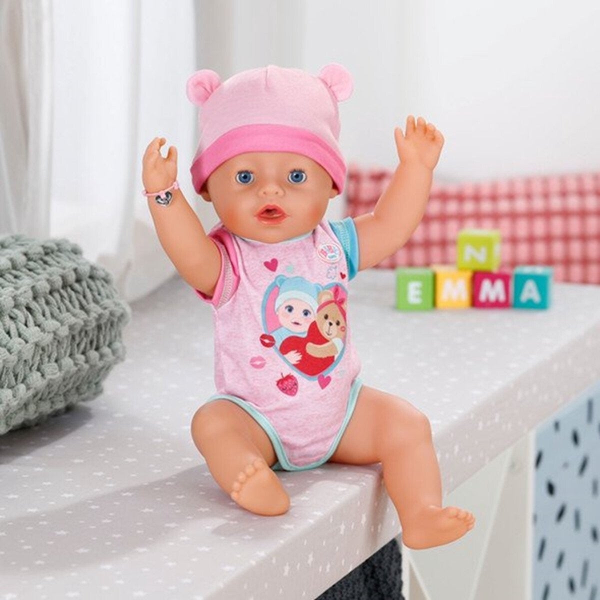 Hier is Emma! Emma, bekend van de BABY born-animatieserie die je kunt bekijken op YouTube en Toggo, is nu ook verkrijgbaar voor jou thuis in haar nieuwe outfit met 10 accessoires. Ze heeft ook haar magische bordje bij zich: als je water giet op het inlegvel op het bord laat het water op magische wijze heerlijke gerechten verschijnen, waardoor het nog leuker is om haar te eten te geven. Zet haar op haar potje nadat je met het eten (met water) hebt gespeeld, of geef haar te drinken en druk dan op haar buik: haar grote en kleine boodschap verschijnen in het potje. Als Emma water drinkt uit haar flesje kan ze zelfs huilen en moet liefdevol worden getroost. Hierbij helpt het magische speentje: als je het 180 graden draait, sluit of opent ze haar ogen. Draai nog een keer en dan gebeurt het tegenovergestelde. Maar leg je haar in haar bedje voor een dutje, dan vallen haar ogen zelfs zonder speen dicht. Maar Emma kan nog meer: ze is superbeweeglijk en je kunt haar zelfs meenemen in bad, omdat ze nu nog sneller droogt. Om de pop na het spelen goed schoon te maken, kun je haar been verwijderen zodat er een grotere opening ontstaat. Zo loopt het water veel makkelijker weg. Voor nog meer creatief speelplezier met haar flesje, speen, bord, lepel, maaltijden en potje heeft Emma nu ook een luier, een geboortebewijs en twee vriendschapsarmbanden bij zich voor een lange en liefdevolle vriendschap tussen kind en pop.