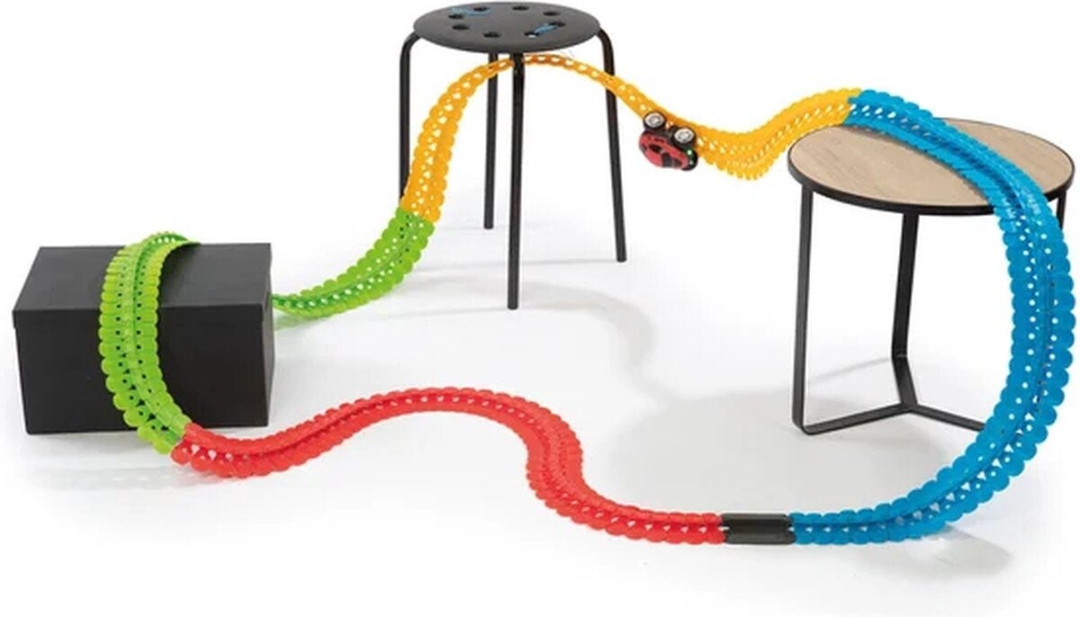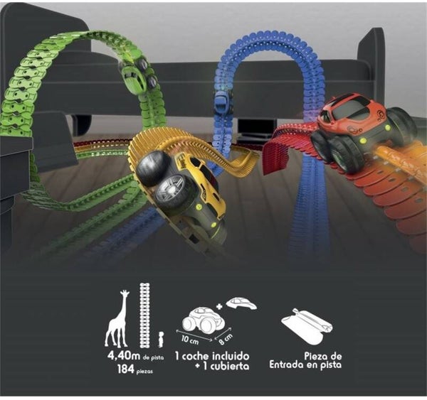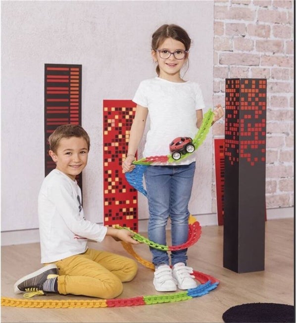 FleXtreme is een hele nieuwe wereld die de creativiteit van kinderen uitdaagt. Samengesteld uit flexibele sporen en voertuigen, kan het kind maak een circuit door de stukken samen te voegen. Dankzij zijn creativiteit en de omgeving die hem omringt, kan hij het circuit zo ongelooflijk mogelijk maken. De rupsen passen gemakkelijk in elkaar en zijn zo flexibel dat het kind hun rupsen over een stoel, hun bed of zelfs hun dressoir kan laten lopen. Maar niet alleen! Looping, ondersteboven, zijwaarts ... Ontdekkingsset bestaande uit 184 tracks, een flexibel circuit van 4 meter 40, een voertuig, een extra carrosserie en een entry / exit track. Batterijen inbegrepen. Vanaf 4 jaar oud.