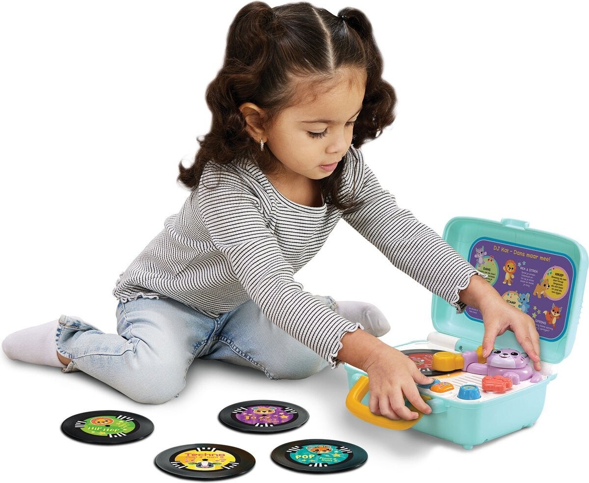 Kies een plaat en dans op de maat! Plaats één van de vijf dubbelzijdige platen op de retro-geïnspireerde muziekspeler en DJ Kat laat je kennismaken met verschillende muziekstijlen. Ontdek de dieren en hun geluiden en luister naar gezongen liedjes, grappige zinnetjes en vrolijke melodietjes. De bijgesloten platen zijn eenvoudig op te bergen en je neemt de platenspeler overal mee naartoe dankzij het handige handvat!