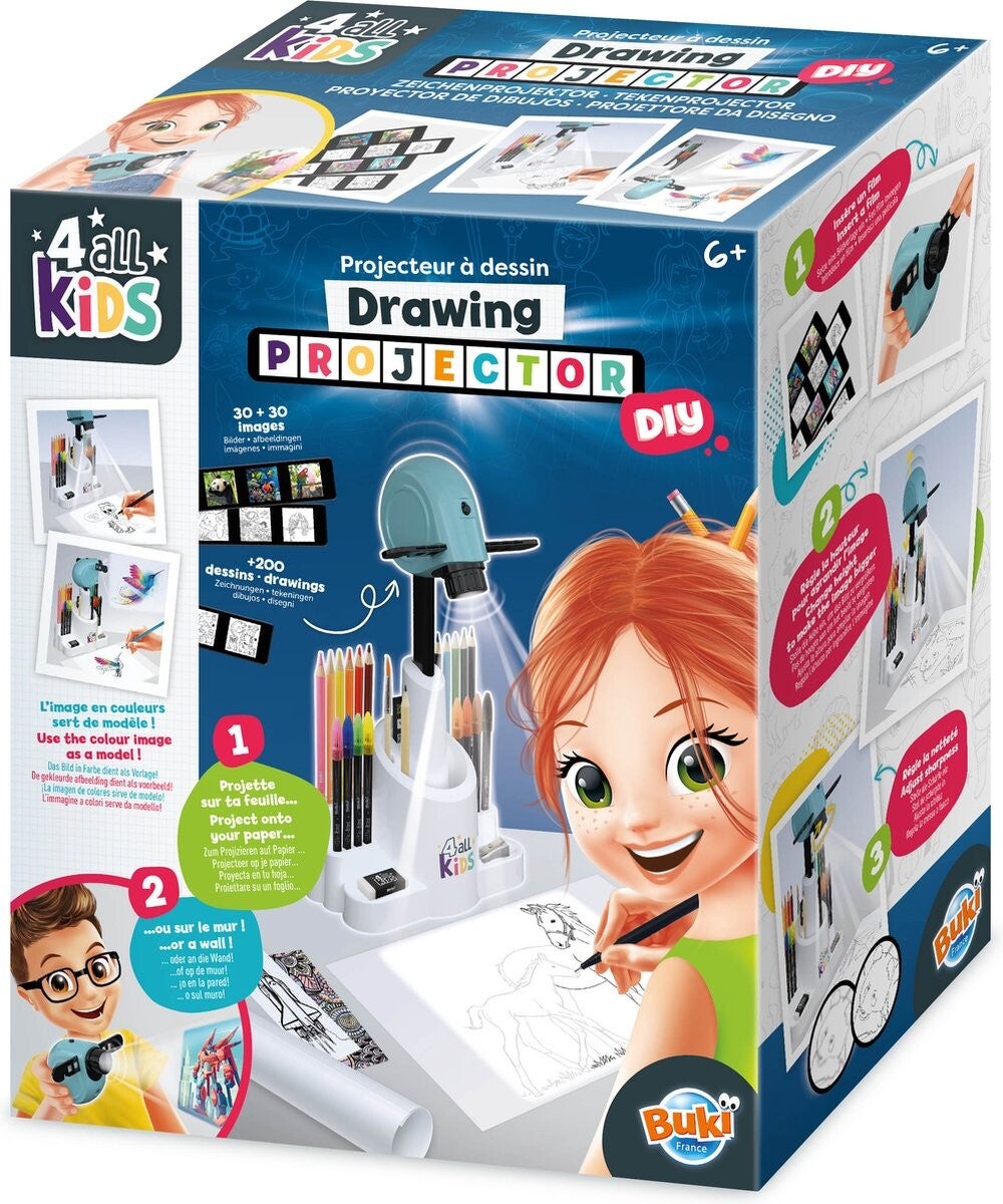 Een projector met twee functies: tekenprojector en beeldprojector. Projecteer de zwart-wit afbeelding op het papier om de contouren te reproduceren en projecteer vervolgens de gekleurde afbeelding op de muur om kleur aan je tekening toe te voegen! De projector is in hoogte verstelbaar en afneembaar zodat je hem in je hand kunt houden en de afbeeldingen in je kamer kunt projecteren! Kan worden scherpgesteld voor meer scherpte. Bevat: 35 afbeeldingen om te reproduceren, 8 aquarelpotloden, 8 viltstiften, een potlood, een gum, een puntenslijper, twee penselen, 40 vellen papier van verschillende afmetingen en diktes, 5 boekenleggers en 1 poster... Volledig in kleur geïllustreerde instructies. Werkt op 3 LR03 batterijen (niet meegeleverd). Vanaf 6 jaar.