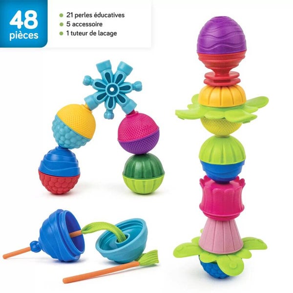 Grote, educatieve, progressieve kralen in verschillende vormen, kleuren en texturen om de fijne motoriek en cognitieve vaardigheden van je kind stap voor stap te ontwikkelen:
