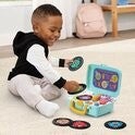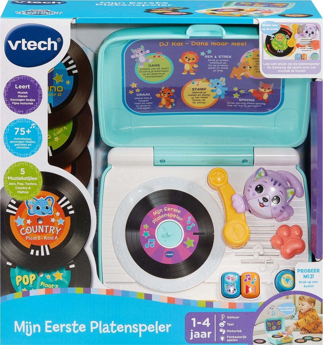 Kies een plaat en dans op de maat! Plaats één van de vijf dubbelzijdige platen op de retro-geïnspireerde muziekspeler en DJ Kat laat je kennismaken met verschillende muziekstijlen. Ontdek de dieren en hun geluiden en luister naar gezongen liedjes, grappige zinnetjes en vrolijke melodietjes. De bijgesloten platen zijn eenvoudig op te bergen en je neemt de platenspeler overal mee naartoe dankzij het handige handvat!