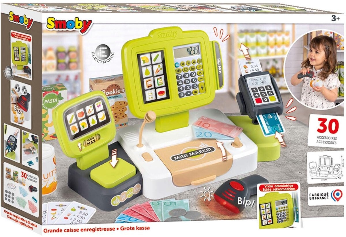 Smoby - Rollenspel - Shopping - Elektronische Supermarkt kassa met kassa lade, echte rekenmachine, dummymicrofoon, creditcardlezer en weegschaal met mechanische actie