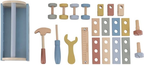 De gereedschapskist bevat onder andere een hamer, schroevendraaier en moersleutel, allemaal gemaakt van stevig en duurzaam hout dat veilig is voor kleine handjes. Dankzij het compacte formaat kan de kist gemakkelijk meegenomen worden, zodat je kindje overal kan spelen en klussen. Alles kan na gebruik netjes worden opgeborgen in de kist, waardoor het altijd overzichtelijk blijft.